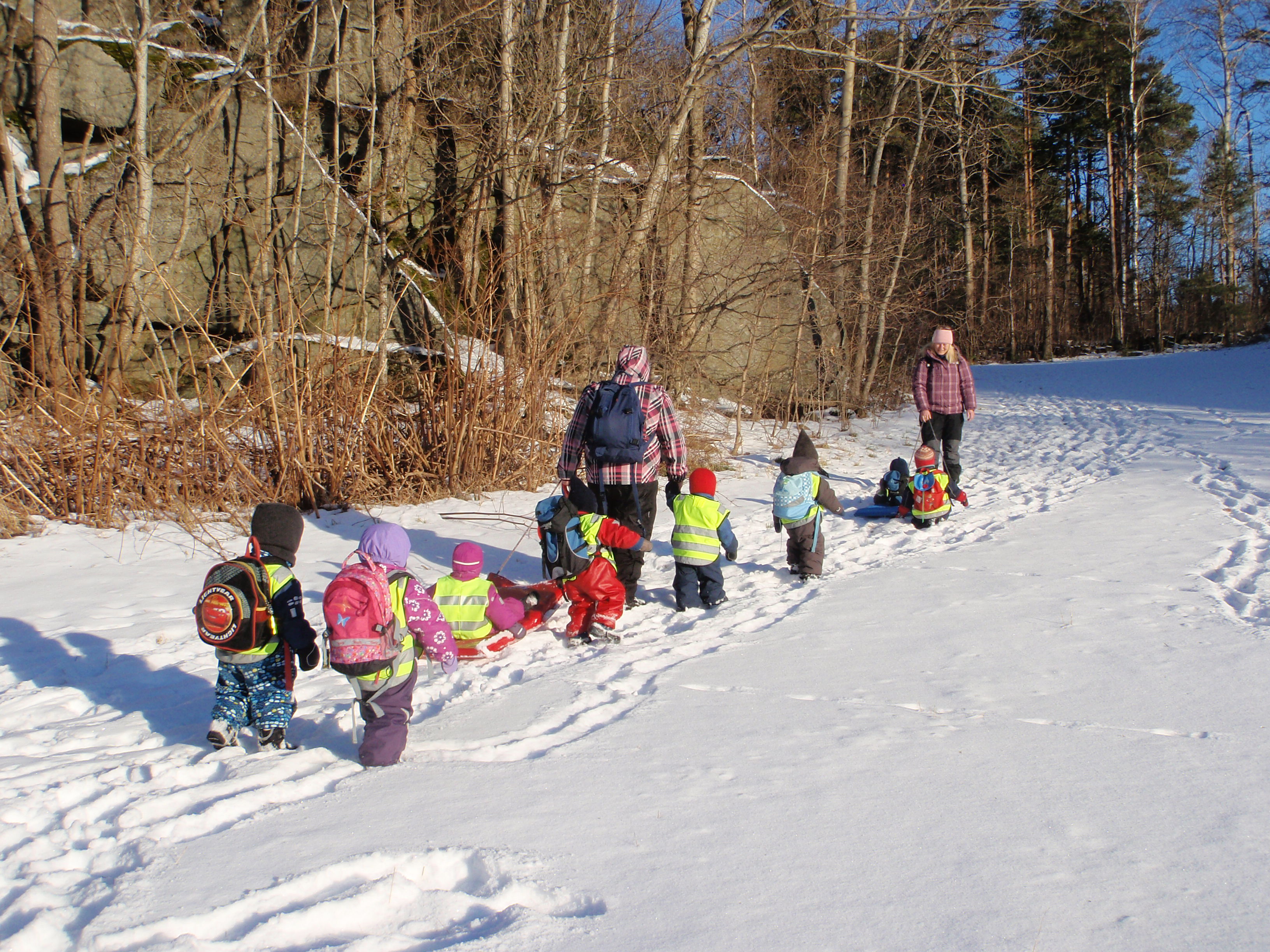 Rød og gul gruppe på Knøttebo var på aketur med akematter og rumpebrett.Etter mye aking, som var kjempegøy, smakte det ekstra godt med matpakke. Det er stor stas å bære egen sekk! Tilbake