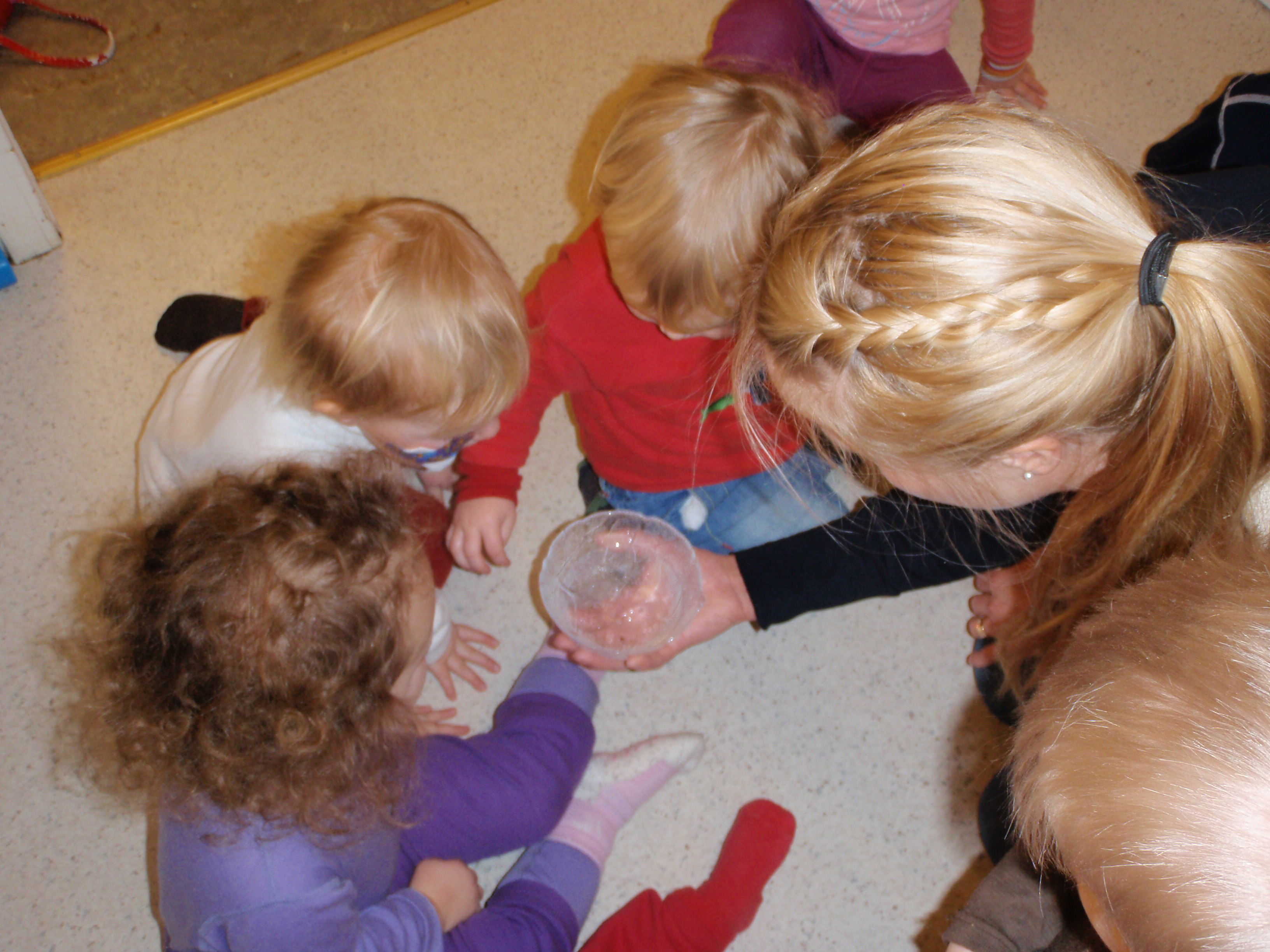 Barna fikk hente inn snø, som vi puttet i en glassbolle. Så var det å sitte og studere, litt venting ble det, men det ble jo til vann!