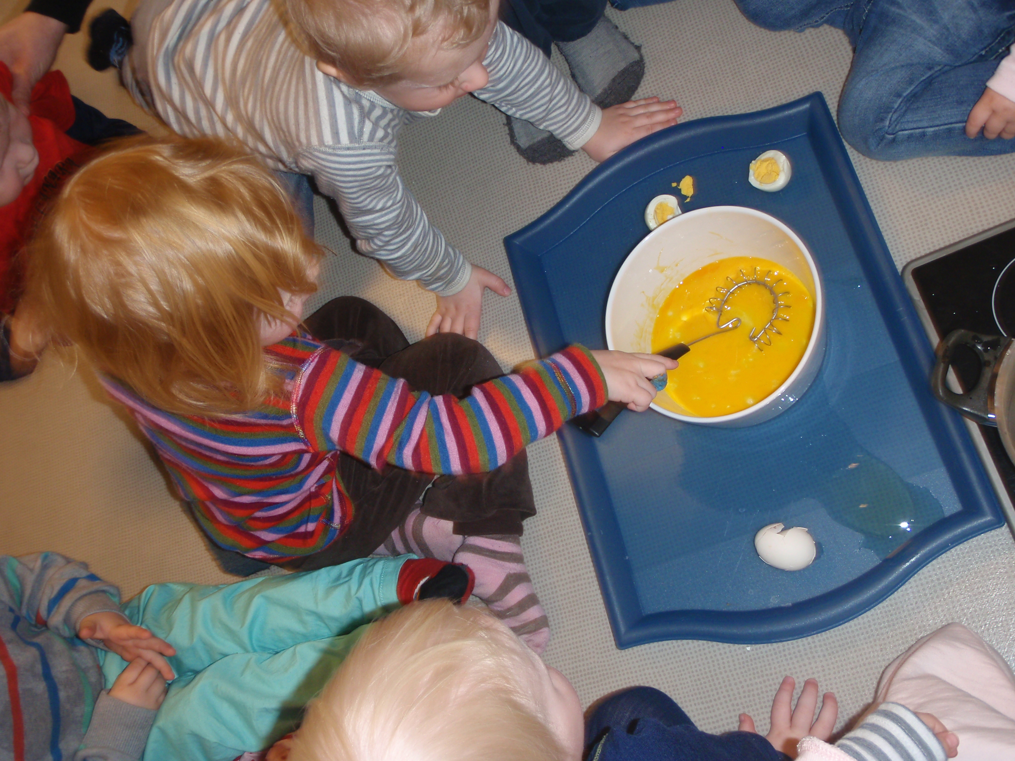 Knøttebo har hatt eksperiment med egg. Barna fikk undre seg over hva som skjer når vi steker og koker egg. Et rått egg fikk barna vispe i en bolle. Mange rare uttrykk å se i barnas ansikter under eksperimentet.