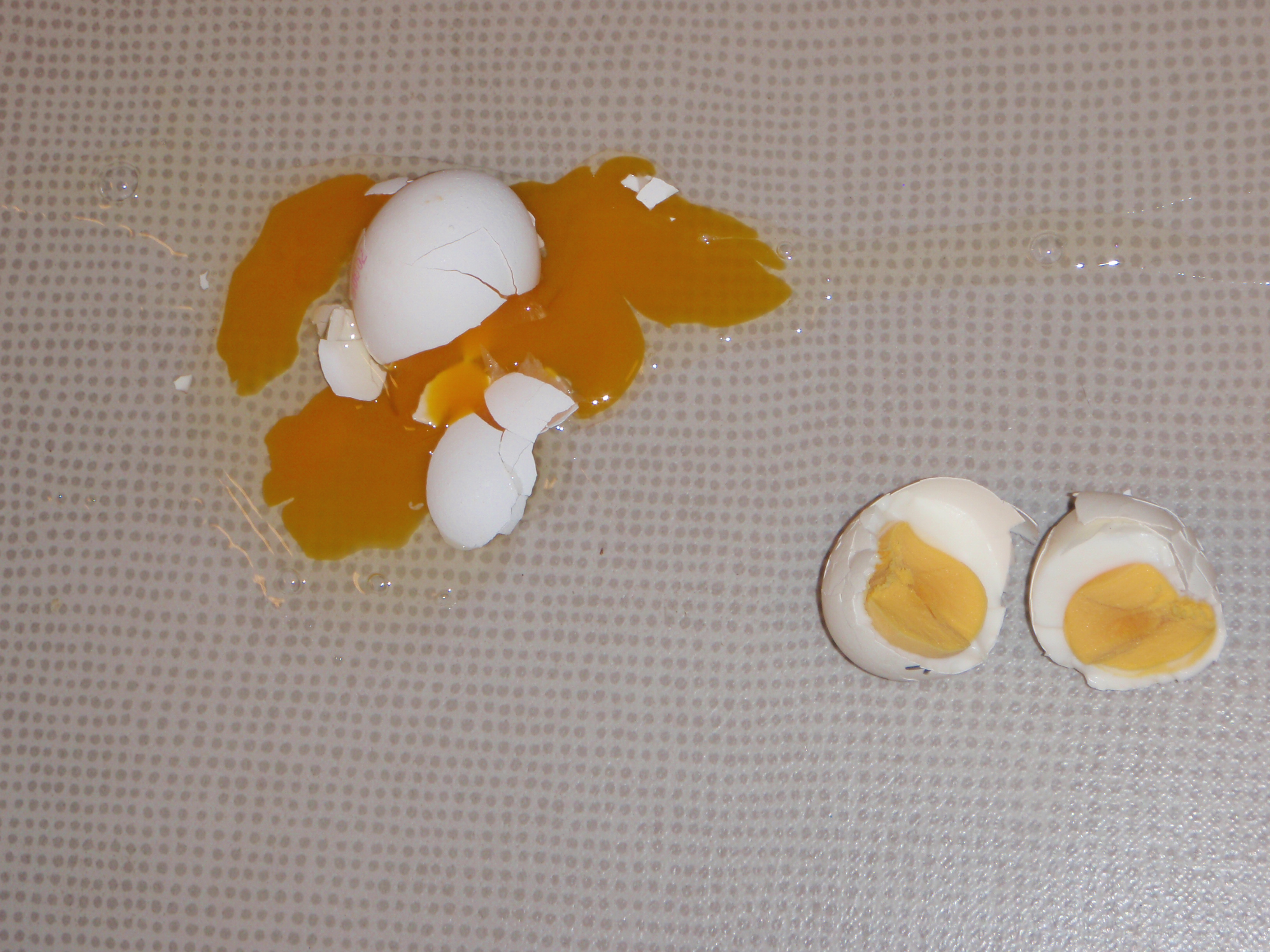 Vi skulle se hva som skjedde med et kokt egg og et rått egg. Først kastet vi et kokt egg i gulvet, det trillet avgårde. Så tok vi det råe egget, splæsj i gulvet!